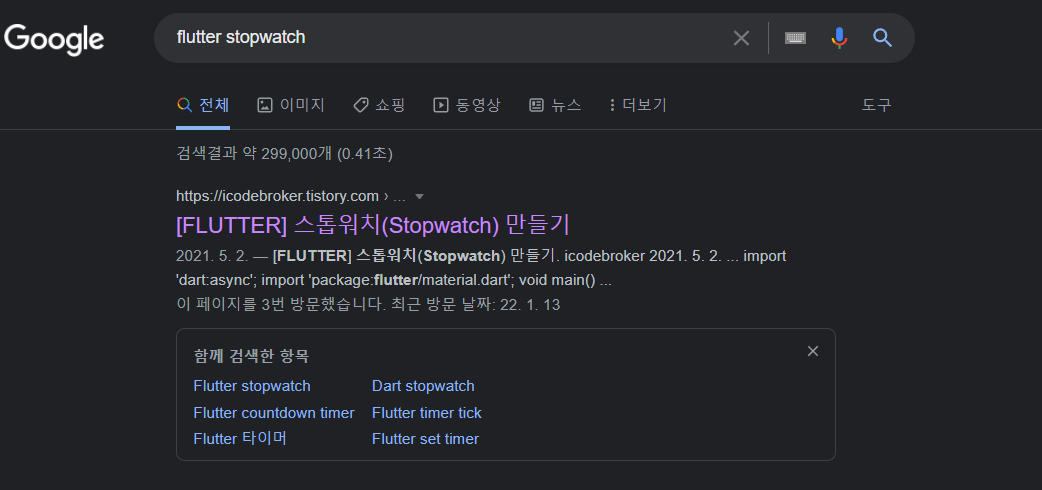 아니 검색을 해봤는데 무슨.. 음.. 어.. 플러터 기본 패키지 3장이 나왔다. 그래서 가볍게 무시해주고, 그 뒤에 스탑 와치 타이머라는 패키지가 있길래 보지도 않고 바로 담았다.