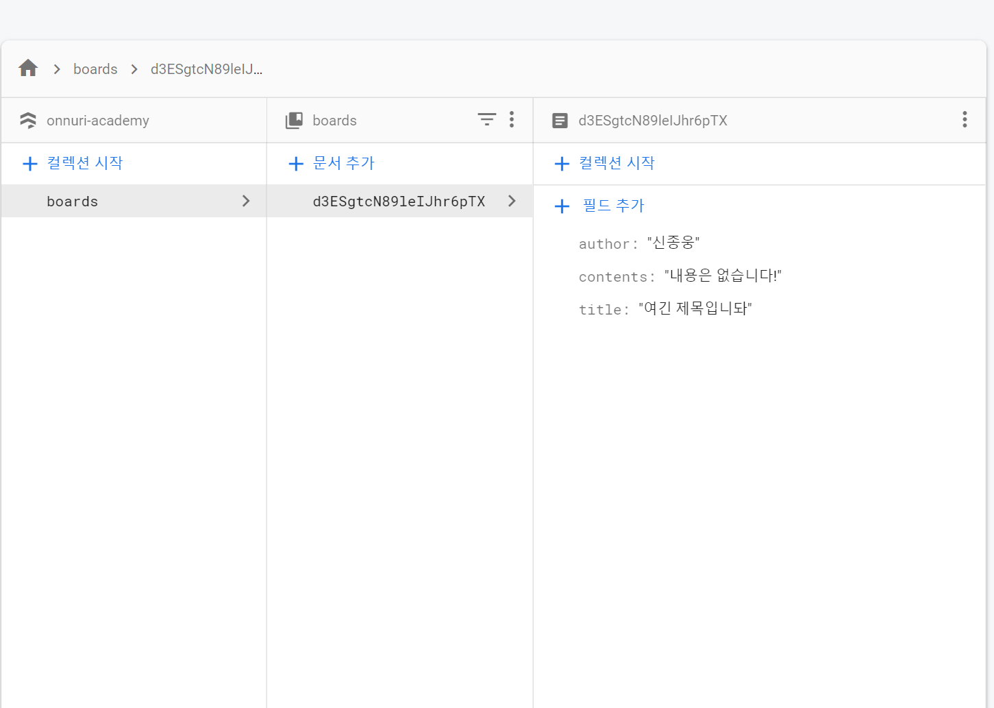 no sql database로 이런식으로 보인다. 나중에 타임스태프 추가해서 시간같은거 띄워주고 하면 될 것 같다.