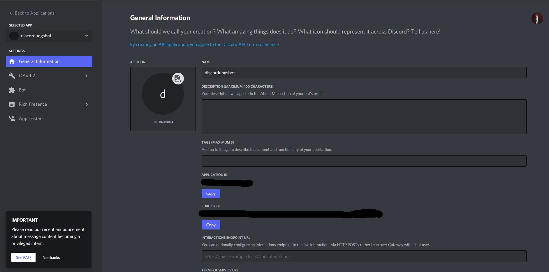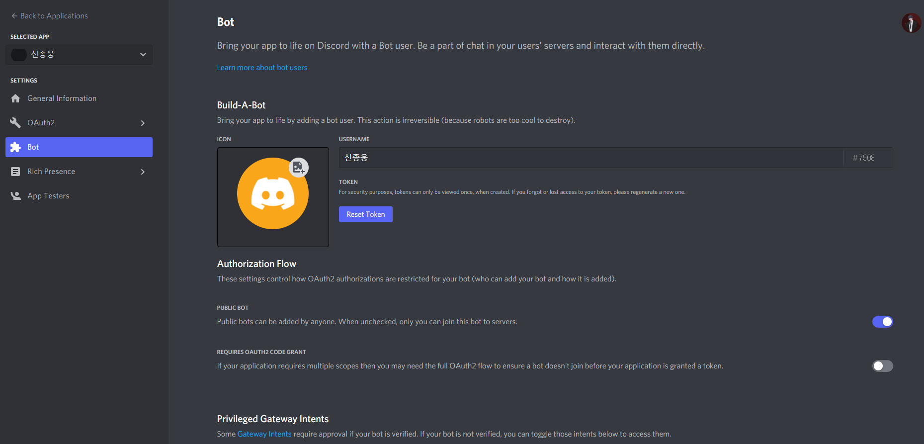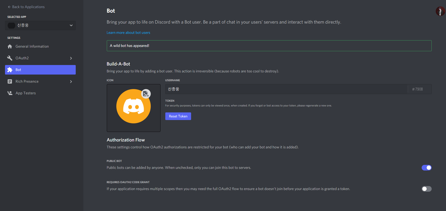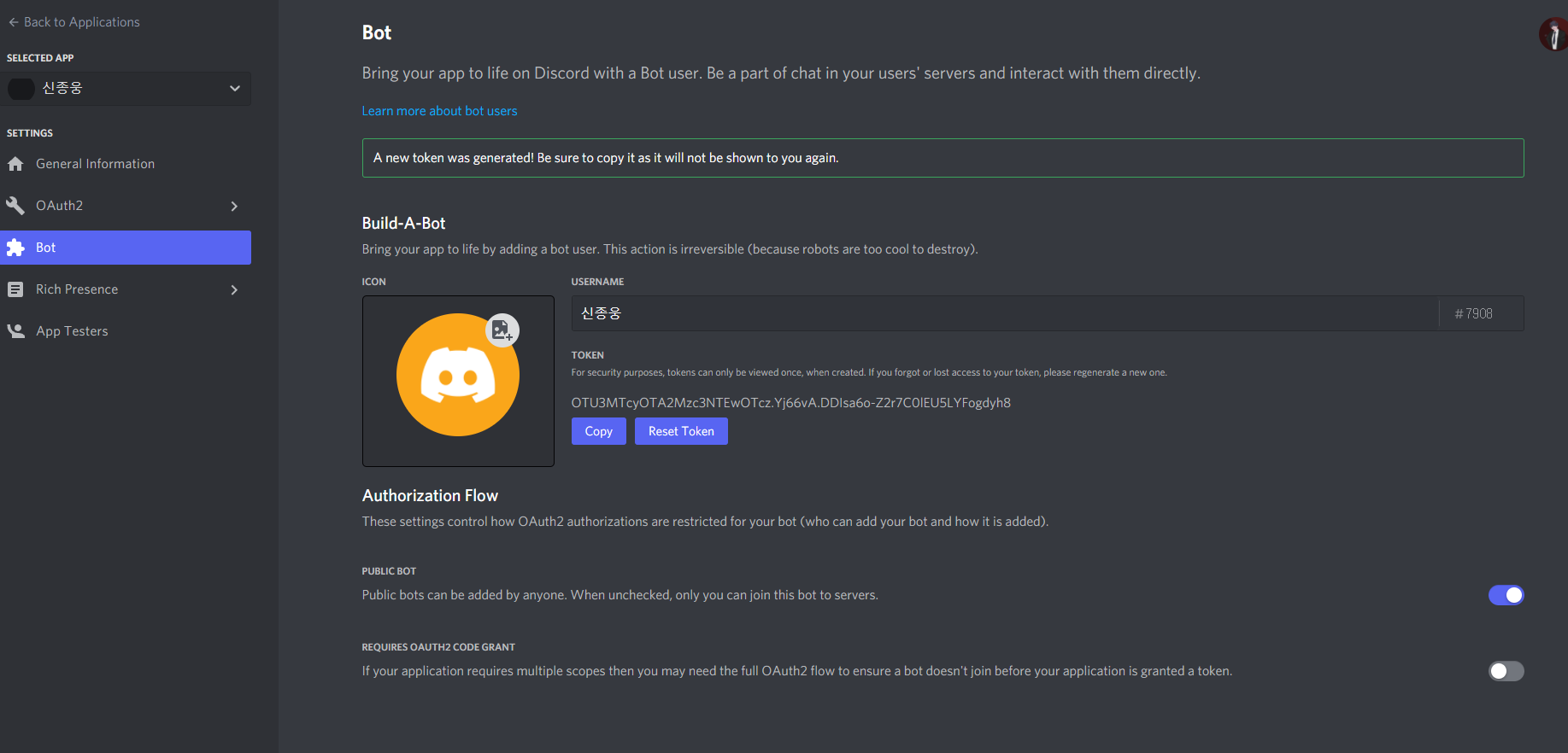 혹여나 Too many users have this name 또는 다른 에러가 뜰 경우 봇 이름을 다른 것으로 바꿔 만들어 주면 된다.