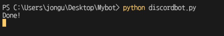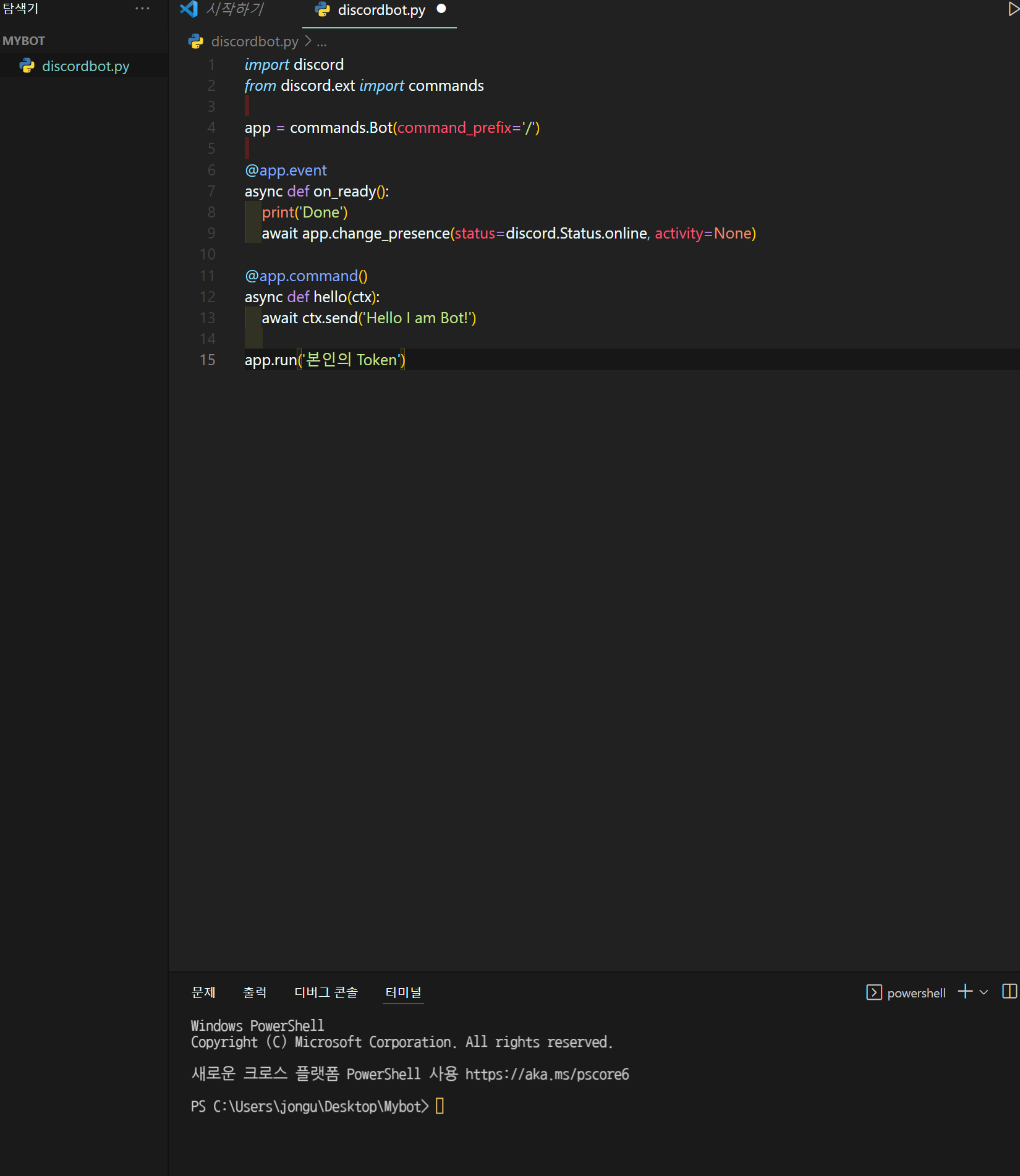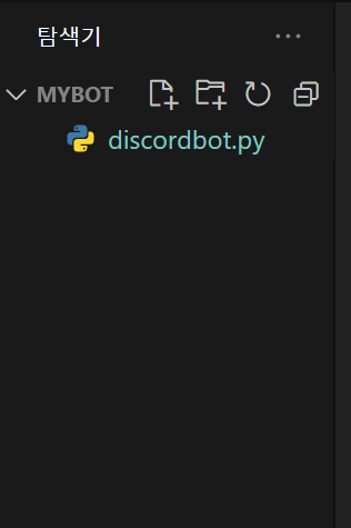 필자의 경우 폴더 이름은 MYBOT 파일 이름은 discordbot.py로 해주었다. 확장자 명은 꼭 py를 지켜 작성 해줘야 한다.