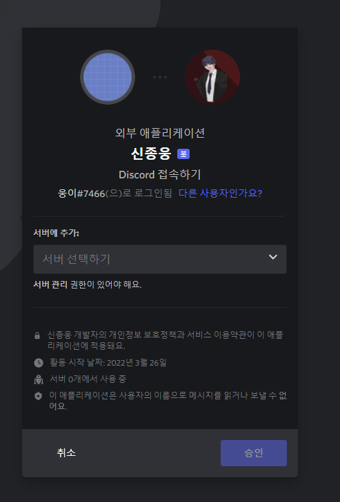 3. 다음과 같은 화면에서 자신의 서버를 선택 해 준 후 승인을 눌러준다.