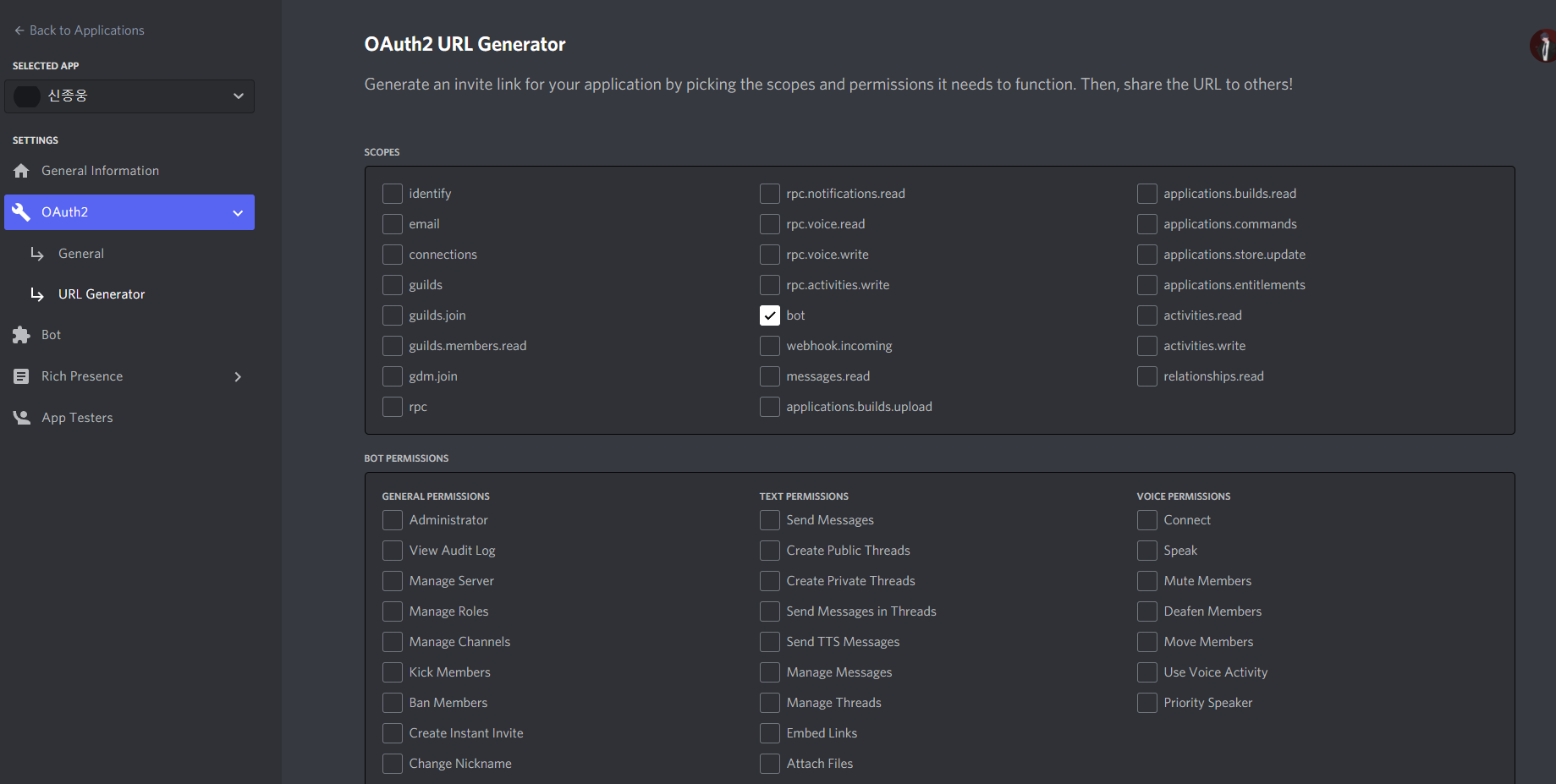 1. 왼쪽 창에서 OAuth2의 URL Generator창을 클릭한다.