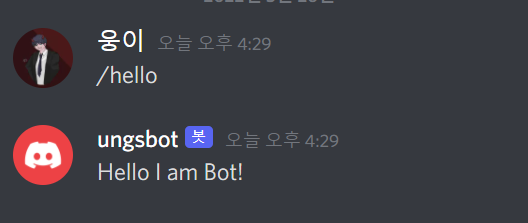 7. 자신이 봇을 초대한 서버에서 /hello를 입력 해보자