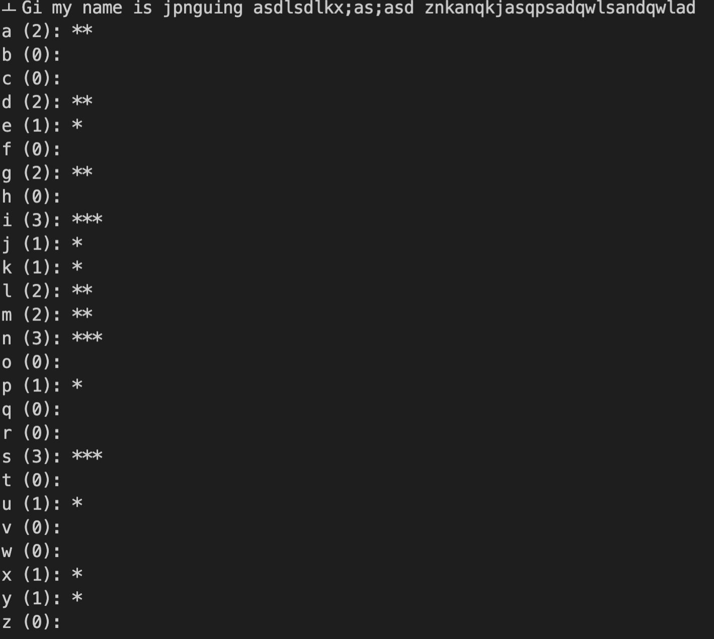 cout << char(i + 97) << " (" << cnt[i] << "): ";