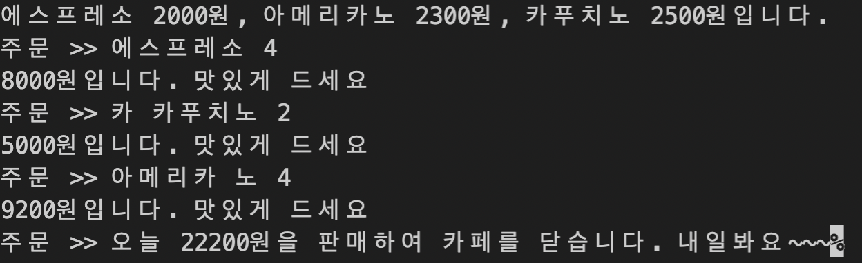 cout << "오늘 " << sum << "원을 판매하여 카페를 닫습니다. 내일봐요~~~";