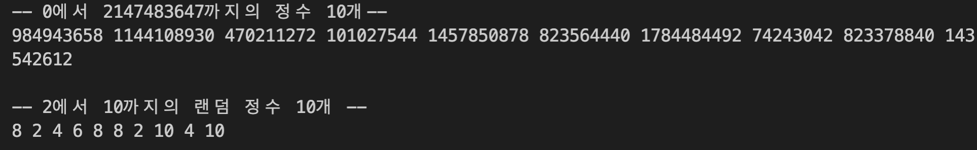 cout << endl << endl << "-- 2에서 9까지의 랜덤 정수 10개 --" << endl;