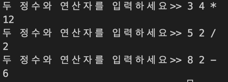 cout << "두 정수와 연산자를 입력하세요>> ";