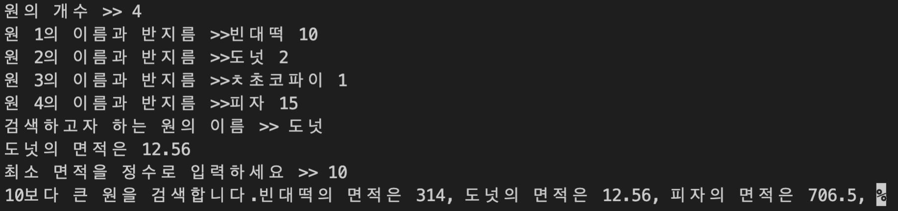 cout << "원 " << i + 1 << "의 이름과 반지름 >>";