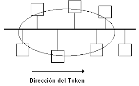 - 토큰링과 버스 방식의 장점을 포함하는 방식으로서 물리적으로는 버스형으로 연결 되어 있으나 실제 동작은 논리적으로 구성된 링 형태로 수행된다. 토큰링 방식과 비슷하게 토큰을 사용하여 collision 발생 가능성을 제거 해주었다. 구조가 간단한 것이 장점이며, 토큰을 가진 PC가 꺼지면 새로운 토큰을 만들고 우선순위를 조정하는 절차를 겪을 때 좋은 메모리를 사용하여야 하기 때문에 사용자에게 부담이 큰 통신 방식이다. IEEE 802.4로 표준화 되었었다.