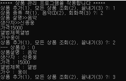 cout << "상품 종류 책(1), 음악CD(2), 회화책(3) ?: ";