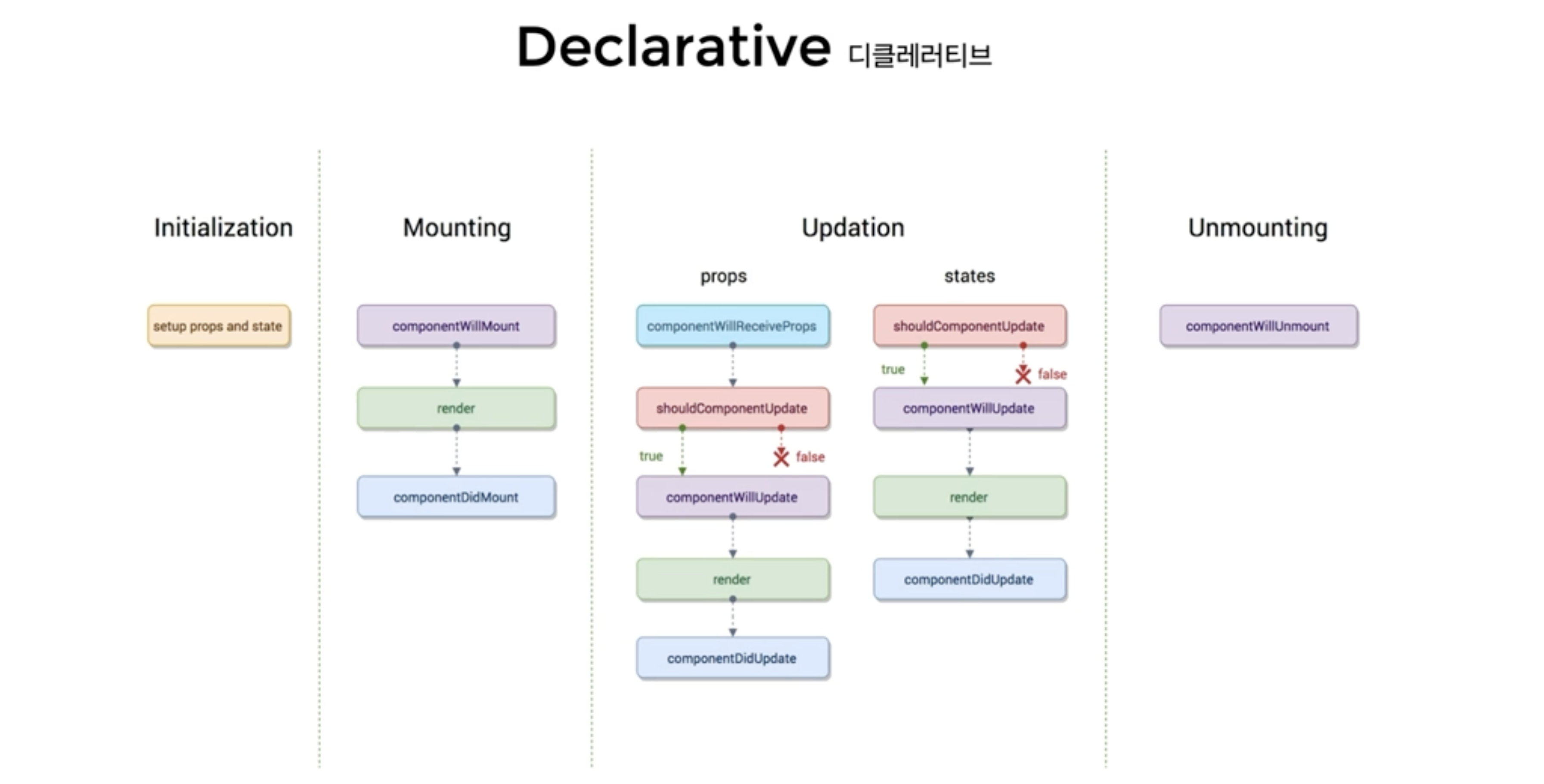 - 그 외 나머지들은 props와 state가 변경되어 렌더 메서드가 실행될 때 실행되는 메서드들이다.
