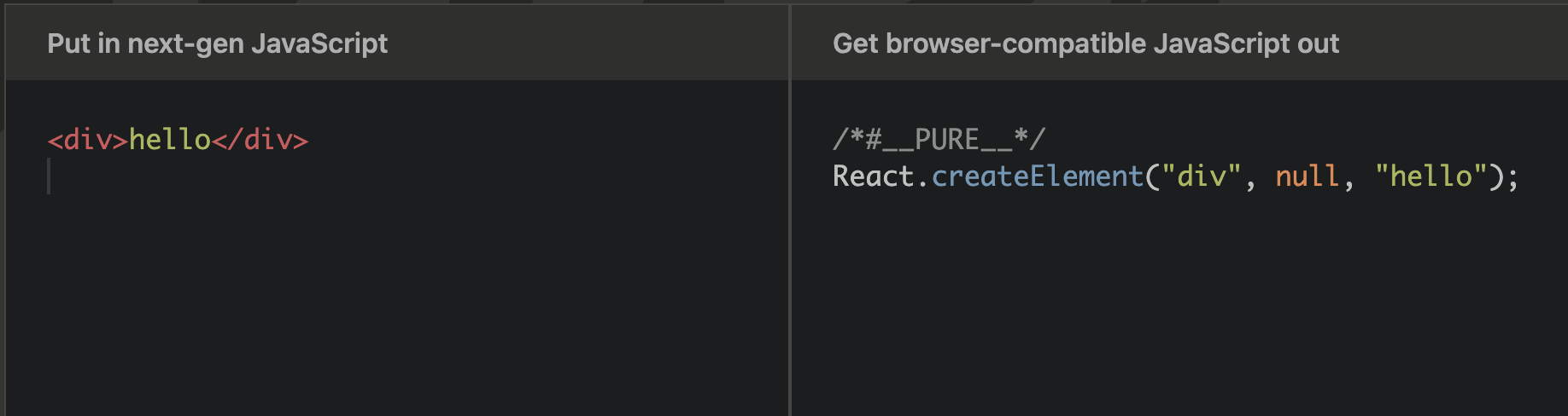 - babel은 우리가 React.createElement를 직접 작성하지 않아도 다음과 같이 트랜스 파일 해준다.