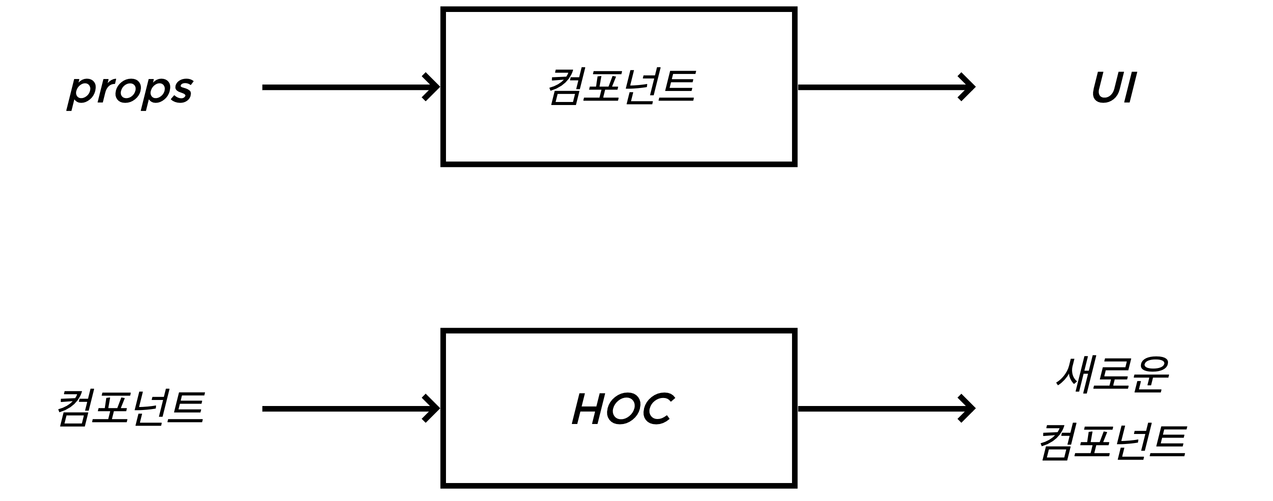 - HOC는 컴포넌트를 인자로 받아 재활용 로직이 적용된 HOC 코드를 거치면 새로운 컴포넌트를 리턴한다.