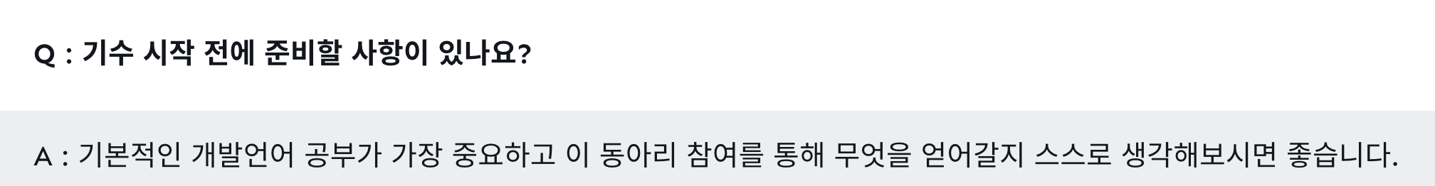 다음 사진은 DND 공식 페이지에 있는 Q&A 글 중 하나인데요, 저는 딱 기본 개발 언어를 아는 사람이었고 프레임워크나 라이브러리 공부는 나중에 해도 가능하다던 DND 운영진님들의 말씀처럼 8주간의 시간 동안 열심히 공부하고 따라가고 찾아봤던 노력들을 통해서 마무리해 낼 수 있었습니다. (같은 팀 프론트 분의 역할도 매우 매우 컸어요!! 갼님짱..)