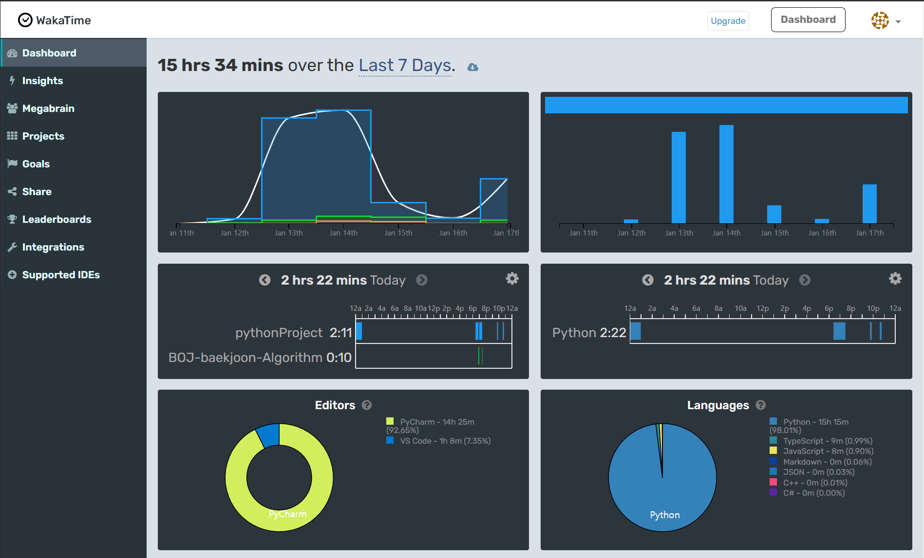학기 중에 Node.js 공부를 하던 도중, 학교 개발 동아리 Megabrain에서 각 동아리원들 코딩 실태 조사(?) 느낌으로 도입했던 Wakatime이라는 서비스가 있었다.