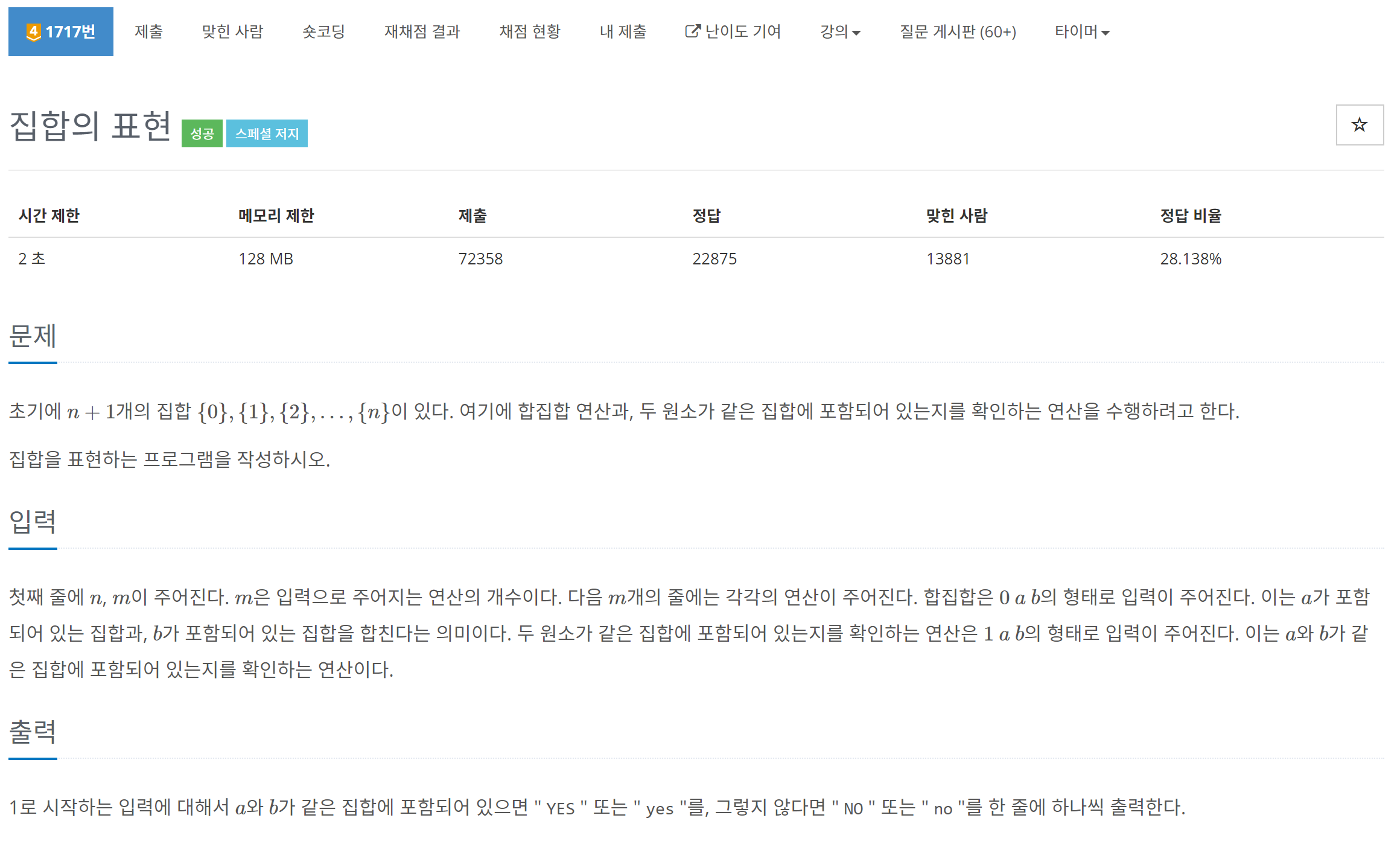 초기에 $n+1$개의 집합 $\{0\}, \{1\}, \{2\}, \dots , \{n\}$이 있다. 여기에 합집합 연산과, 두 원소가 같은 집합에 포함되어 있는지를 확인하는 연산을 수행하려고 한다. 집합을 표현하는 프로그램을 작