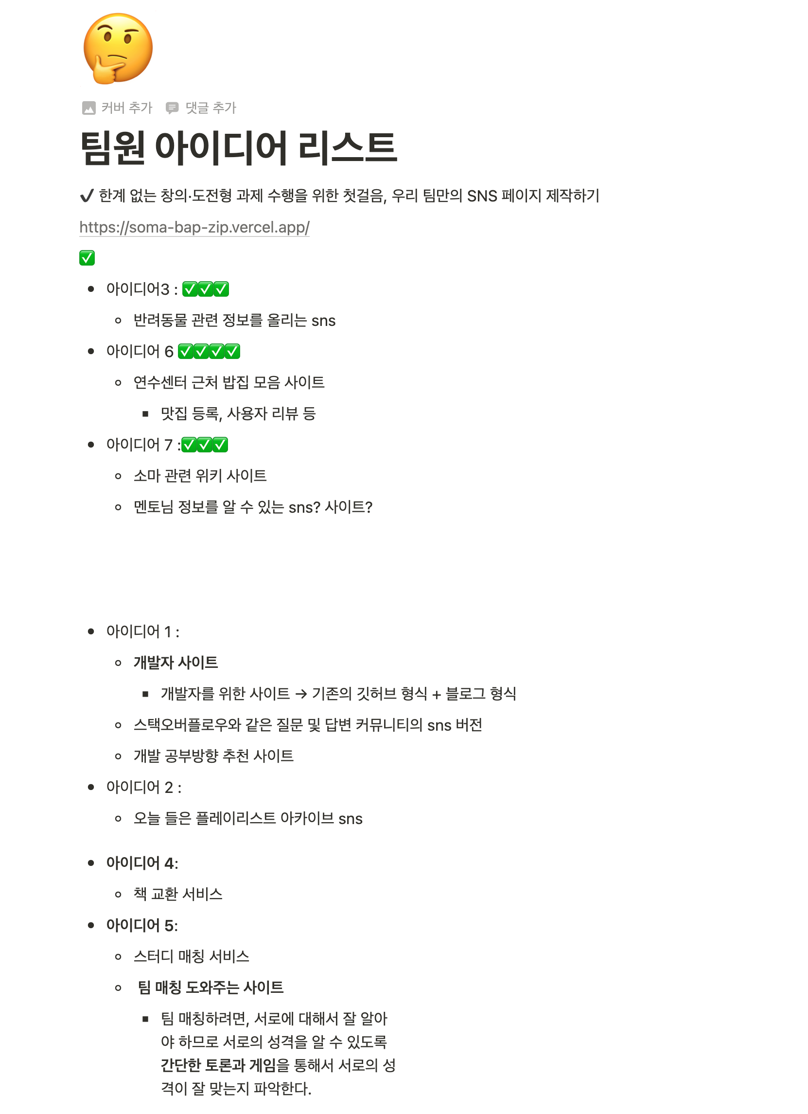 다양한 아이디어들이 나왔고, 내가 이미 기획하고 개발 중이던 소마 BAP.ZIP이라는 프로젝트로 하기로 했다.