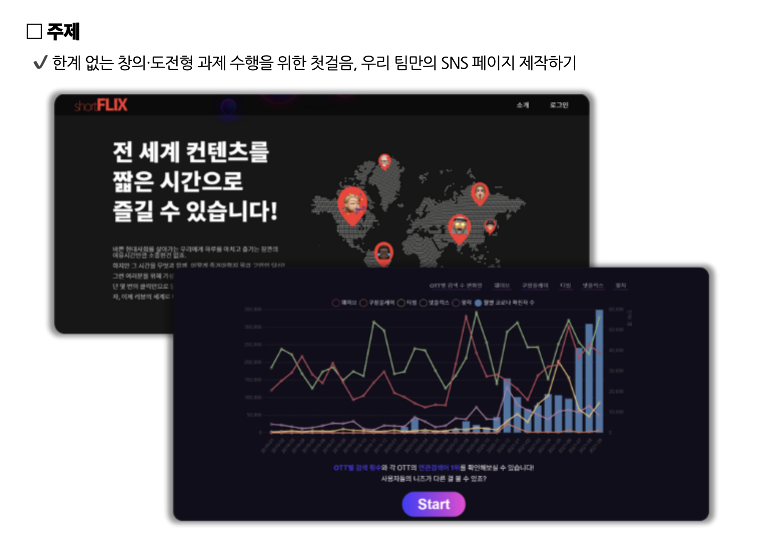 우리 팀만의 SNS 페이지 제작하기가 주제였다. 앞서 아이디어톤에서 했던 주제와 거의 비슷한 주제였던 것 같다.