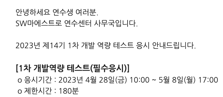 갑자기 개발 역량 테스트를 보라고 했다. 다른 기수때는 없던 새로운 테스트인 것 같았다. 신기한 점은 평가영역에도 들어가지 않고, 그냥 연수생 실력 평가를 하겠다는 것 같았다.