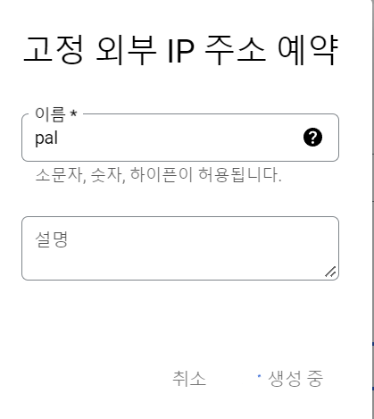 - 외부 아이피 주소 -> 고정 외부 IP 주소 예약 -> 이름 아무거나 넣고 생성